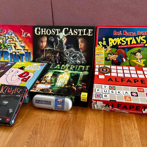 Paket med tre spel bestående av brädspel och kortspel. Innehåller Fungi, Dungeon Mayhem samt Epic Spell Wars of the Battle Wizards. Spelen är i originalkartonger med spelplaner och kortlekar enligt respektive spel. Lämpliga för spelkvällar för flera spelare och för den som är intresserad av strategispel och humoristiska kortspel.