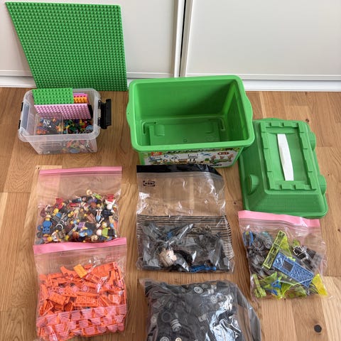 4 kg blandat Lego med allt möjligt från gubbar,hjul,olika bitar i olika färger & en Lego platta att bygga på 30x30. Vissa paketet ej öppnade!