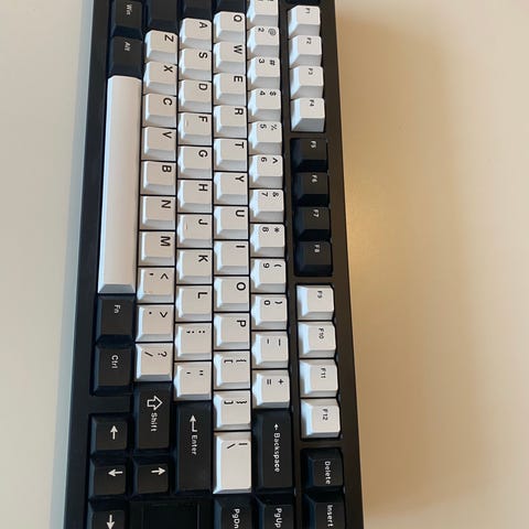 75% layout. Aluminium frame. Switcharna/brytarna är Gateron röd speed. Ett mycket fint helt vitt tangetbord som väger en del och känns premium.