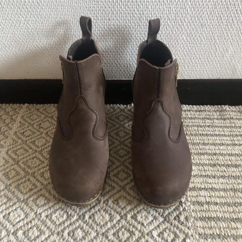 Swedish hasbeens träskor i storlek 37. Färg: Natur. Klack höjd 6,5 cm. Endast använda några gånger. Fint skick. Säljes pga för små för mig. Nypris: 1300:-. Originalkartong medföljer.