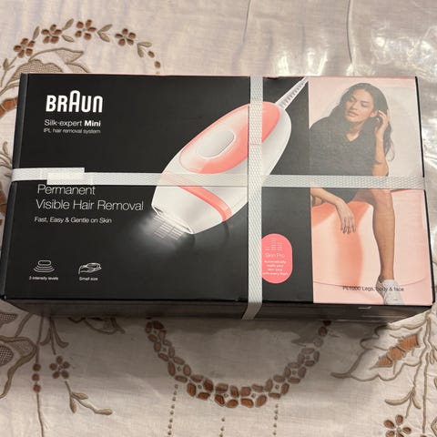 Enheten använder IPL‑teknik (intensivt pulserande ljus) för hårborttagning. Apparaten har handtag med avtryckare, display och strömknapp på ovansidan. I förpackningen ingår basenhet, utbytbara ljusfönster/munstycken samt nätadapter med sladd.