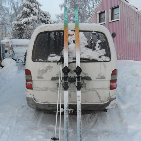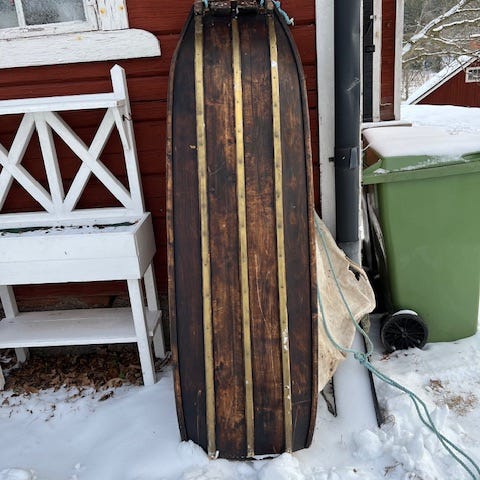 Tegnäs skogsskidor i nyskick med bindningar och stavar.
