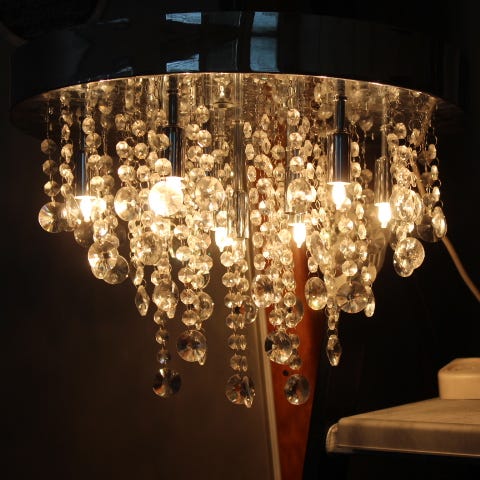 Stor vacker taklampa. 10 armar/lampor. Svart genomskinligt nät runtom. Kromad krona. Kristaller. Höjd 68 cm, diameter 50 cm. Fullt komplett och fungerande.