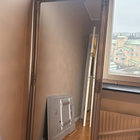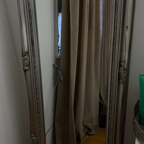 Spegel med dekorativ ram. Baksidan har upphängningsbeslag för montering på vägg.