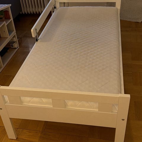 Hemmagjord stabil och fantastisk fin barnsäng med karaktär. Stort affektionsvärde! Vitgrön harlequin-tapet i gaveln.