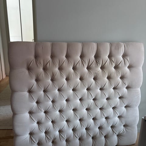 Mio sänggavel i stoppad modell med knapptuftad framsida. Klädd i grå sammetsliknande textil. Passar som huvudgavel till säng och placeras mot vägg bakom sängram eller resårmadrass. Ger ett mjukt ryggstöd vid sittande i sängen och skyddar väggen bakom.
