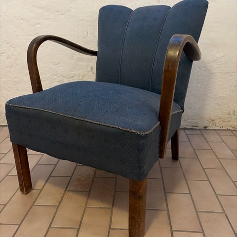 Tyget samt stoppning är hela men man kanske borde klä om den då tyget verkar vara original från 60-tal