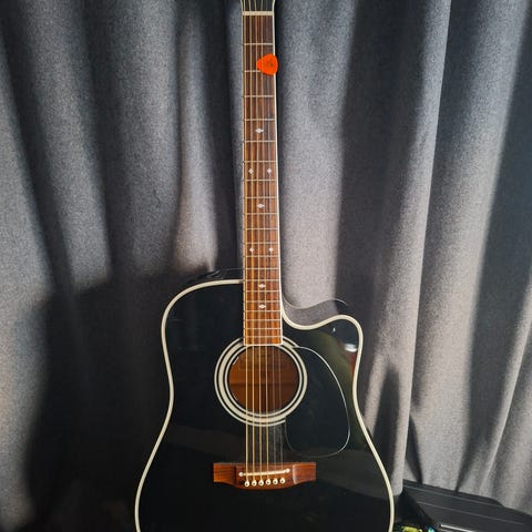 Levin akustisk gitarr med cutaway-kropp i svart högglansfinish. Gitarren har sex strängar, stämskruvar i metall och greppbräda med positionsmarkeringar. Utrustad med inbyggd elektronisk preamp med reglage för volym, diskant, mellanregister, bas, presence och tuner, samt utgång för anslutning till förstärkare eller ljudsystem. Passar för spel akustiskt eller uppmickat i olika musikstilar.
