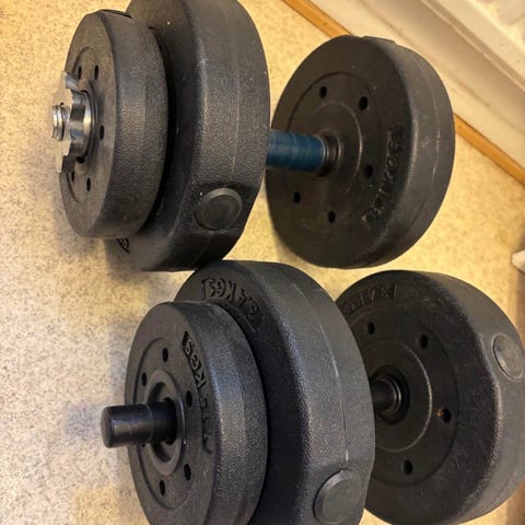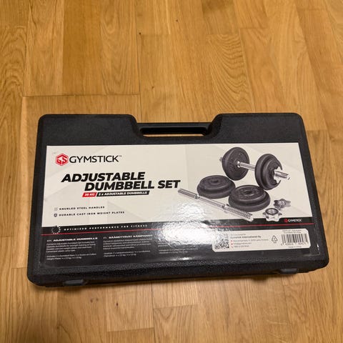 Säljer ett BCBIG justerbart hantelset (köpt via Amazon). Smidigt 2-i-1 set där du kan köra som två hantlar eller koppla ihop till en skivstång med förlängningsstång/connector (se bilder).
