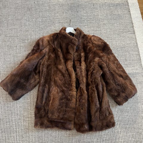 Vinterjacka för dam i storlek 42. Jackan är brun med mönstrad, pälsliknande yta och har en rak passform. Den är helfodrad med mörkt innerfoder och stängs med knappar framtill. Modellen har ståkrage och långa ärmar. Två stora fickor fram. Passar som varm ytterjacka under kallare väder. Unisex modell.