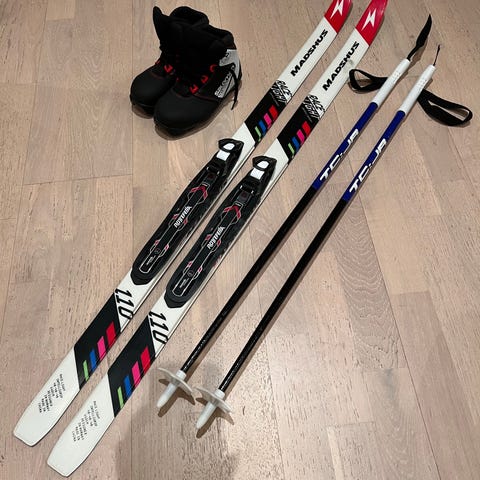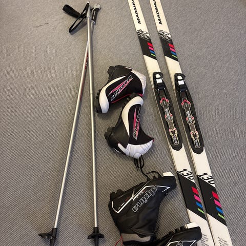 Allt köpt nytt på XXL för ett par säsonger sedan, endast använt sparsamt av ett barn. De har en grundbehandling så att det blev roligare att åka 😀. Mvh Katarina