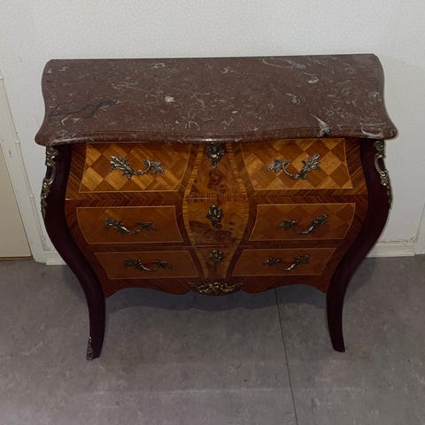 IKEA Aage Petersen byrå i trä. Byrån har svängda sidor, dekorativ fanér med mönster och flera lådor med metallbeslag. Passar som förvaringsmöbel i exempelvis vardagsrum, sovrum eller hall.