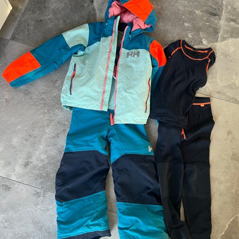 Helly Hansen skidställ för barn stl 110 i tvådelad modell med jacka och byxa. Jackan är flerfärgad i blå toner med orange detaljer och huva. Byxorna är mörkblå med Helly Hansen-logotyp på benet. Passar som ytterkläder för barn vid snö- och höstväder.