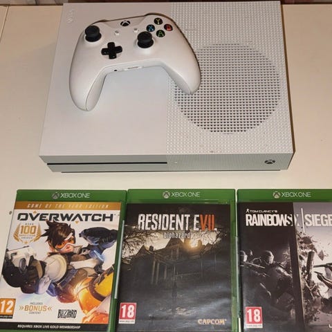 Microsoft Xbox One spelkonsol svart med handkontroll och spel