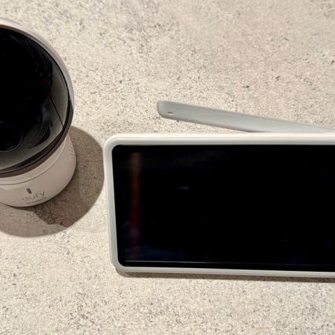 Angelcare babyvakt med bildskärm i vit färg. Enheten består av föräldraenhet med display samt kameraenhet, båda med tillhörande nätadaptrar. Systemet är avsett för övervakning av spädbarn eller småbarn i hemmet, med möjlighet att se och höra barnet från ett annat rum. Passar för inomhusbruk och kan placeras på plan yta eller hylla enligt tillverkarens anvisningar.