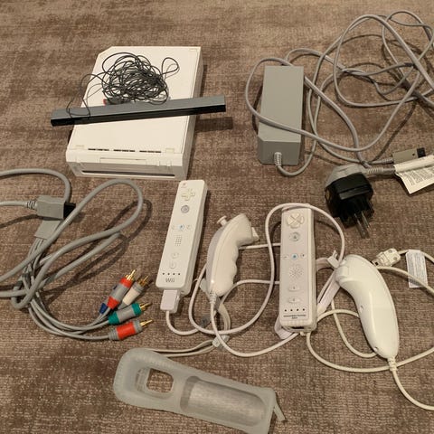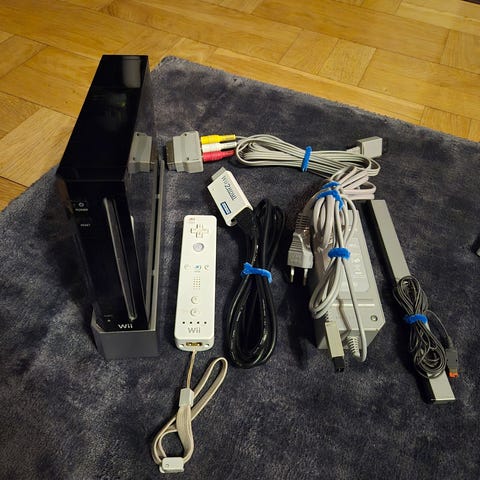 Nintendo Wii spelkonsol i svart utförande. Konsolen är komplett med sensorbar, strömkabel och bild-kabel. Säljes utan kontroller, då de såldes separat för ett tag sedan.