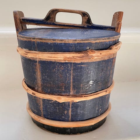 Trä smörkärna och låda med öppningsbart lock. Smörkärnan består av en cylindrisk behållare med lock och stöt. Passar som bruksföremål eller inredningsdetalj i exempelvis kök, förråd eller fritidshus.