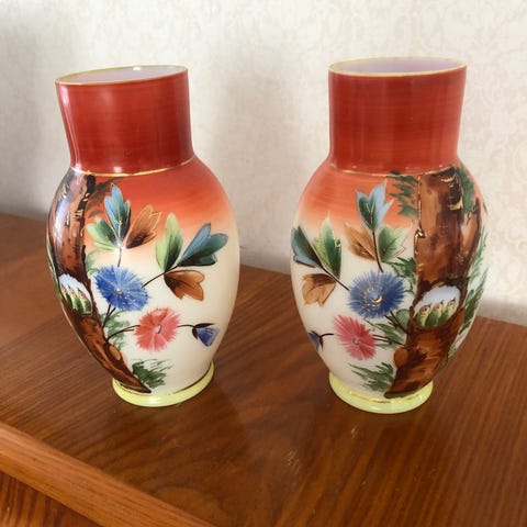 Två vackra, handmålade porslinsvaser i vitt med färgglada blommor och små insekter som motiv. Båda är signerade undertill med "ALF", troligen en lokal konstnär.