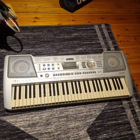 Yamaha PSR-E323 keyboard med 61 fullstora tangenter i silverfärg. Modellen har inbyggda högtalare, display i mitten samt ett flertal knappar för att välja olika röster, stilar och låtar. Perfekt piano och synth för att lära sig spela på.