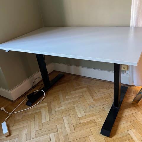 Höj- och sänkbart sidobord i vitt. Bordet har rektangulär bordsskiva och T-format stativ som ger stabilitet. Justering av höjden sker med en spak under bordsskivan. Passar exempelvis som laptopbord, sängbord eller avlastningsbord i vardagsrum eller sovrum. Viss slitage och märken kan förekomma på bordsskiva och stativ, se bilder för skick