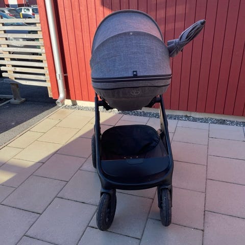 Vi har verkligen uppskattat att vagnen är både lättkörd men samtidigt robust och fungerar på grusvägar och i snö. Att alla delar är kompatibla med varandra har gjort att vi kunnat använda den hela barnets barnvagnsperiod, från födsel upp till övre treårsåldern. Vagnen är också väldigt bra att köra för långa personer då barnet ligger lite högre än vanligt, och det ställbara handtaget fungerar smidigt. Vi har hittat en kosmetisk defekt på handtaget där lite av plasten lossnat (se sista bilden), i övrigt mycket gott skick - särskilt babyskydd och liggdel som använts väldigt kort period.