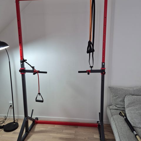 Master Fitness power rack för styrketräning. Ställningen är i metall och grå till färgen och är utrustad med flera grepp för chins/pull-upps. Utrustningen är avsedd för styrketräning i hemmagym eller liknande miljö och kan användas för övningar som bänkpress, knäböj, marklyft och chins.