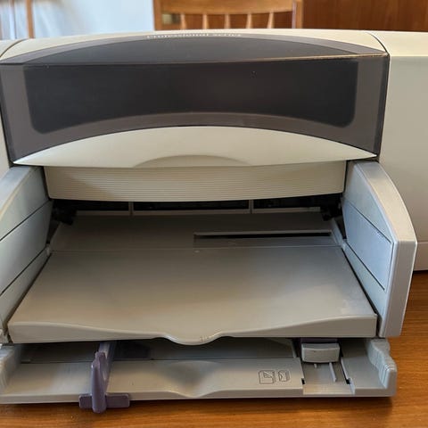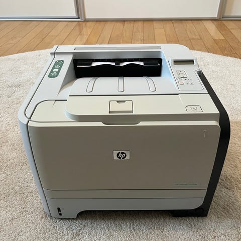 HP LaserJet 1100 laserskrivare i grå färg. Modellen är en kompakt svartvit laserskrivare avsedd för utskrift av dokument. Pappersmatning sker från övre fack och utskrifterna kommer ut framtill. Skrivaren ansluts till dator och lämpar sig för enklare kontors- eller hemanvändning där man behöver skriva ut textdokument på vanligt papper.