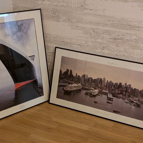 Två inramade konstmotiv i rektangulärt format. Motiven visar detaljerade närbilder: en tavla med närbild av en Louis Vuitton koffert och en tavla med motiv med flera skrivmaskiner i svartvitt. Båda tavlorna är inramade med vit passepartout och tunn svart träram.