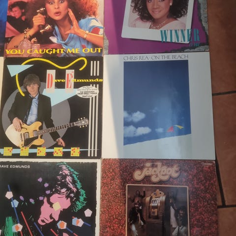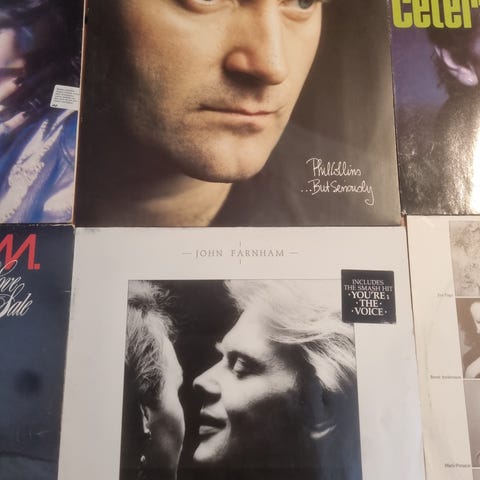 En samling vinylskivor från olika artister. Samlingen består av LP-skivor och singlar, främst popmusik och hits. Omslagen visar olika utgåvor och artister. Skivorna kan spelas på skivspelare som stöder både LP-skivor och singlar och är lämpliga som samlarobjekt eller dekorationer. Det exakta antalet skivor finns i listan.