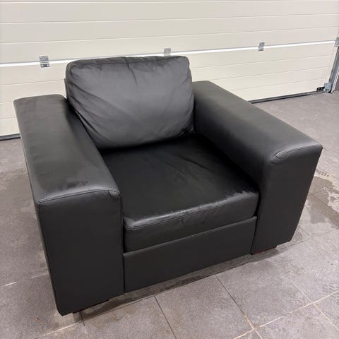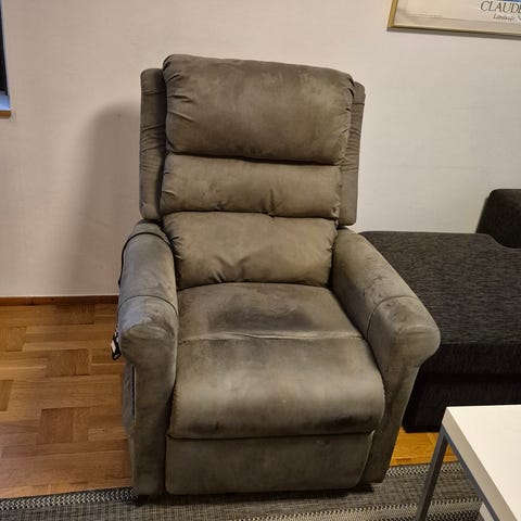 Fåtölj i grått konstläder. Modellen har bred sits, hög rygg och kraftigt vadderade armstöd för mjukare sittkomfort. Passar i vardagsrum eller tv-rum som enskild sittplats eller som komplement till soffa. Ufälltbart fotstöd.