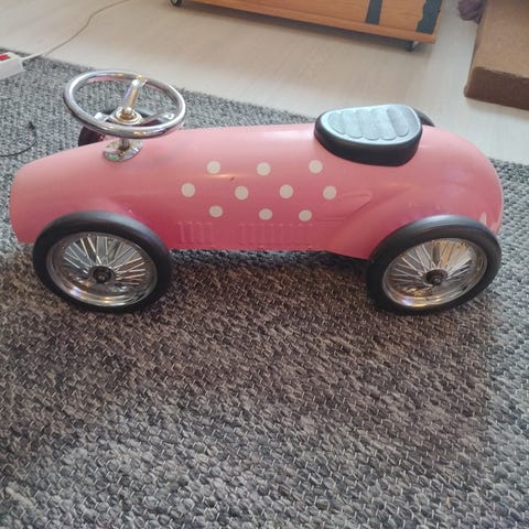 BRIO gåbil i rosa färg. Modellen har fyra hjul, svart ratt med röd signal och svart sits. Karossen är i plåt med tryckta blommor på sidorna. Lämplig som leksak för mindre barn att sitta på och ta sig fram genom att sparka med fötterna mot golvet. Passar för användning inomhus eller på släta ytor utomhus under uppsikt av vuxen.