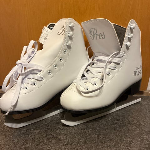 Spin skridskor i storlek 39. Modellen är vita med snörning och har fodrad insida för ökad komfort. Skridskorna är avsedda för övriga skridskosporter och passar för åkning på isbanor och sjöisar där denna typ av skridsko används.