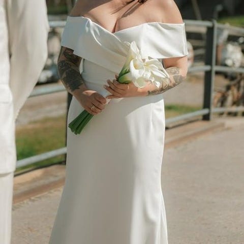 By Malene Birger klänning för dam i storlek S. Lång vit klänning i siden med figurnära överdel och utsvängd nederdel. Modellen har slits framtill och axelbandslös överdel med draperad v-ringning. Passar exempelvis som fest- eller brudklänning.