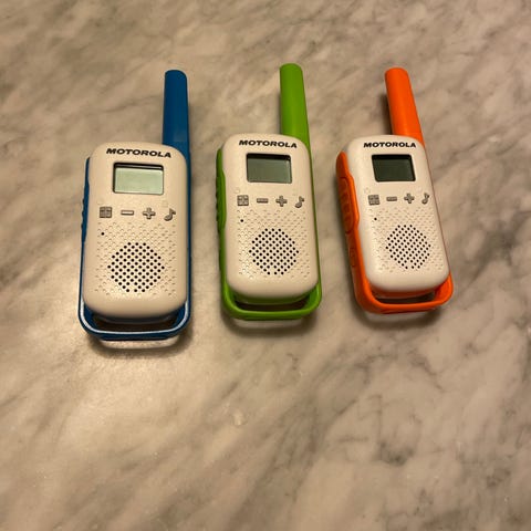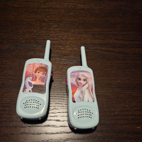 Marvel Spiderman walkie talkies i röd och blå plast. Setet består av två enheter med motiv av Spiderman på framsidan. Varje enhet har antenn, högtalare, mikrofon och knapp för att prata.