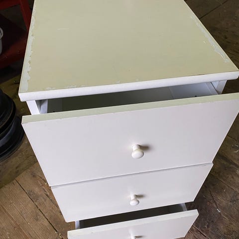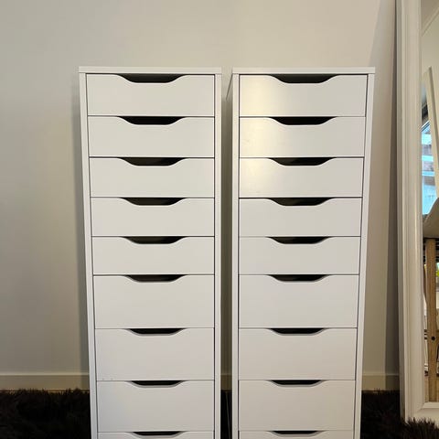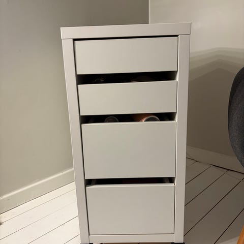 En vit hurts med lådor säljes, från IKEA i modellen Alex. Sparsamt använd, men det finns några små borrhål på baksidan som vi nu har spacklat igen. Se bild nummer tre. I övrigt är skicket toppen. Hämtas i Skövde.