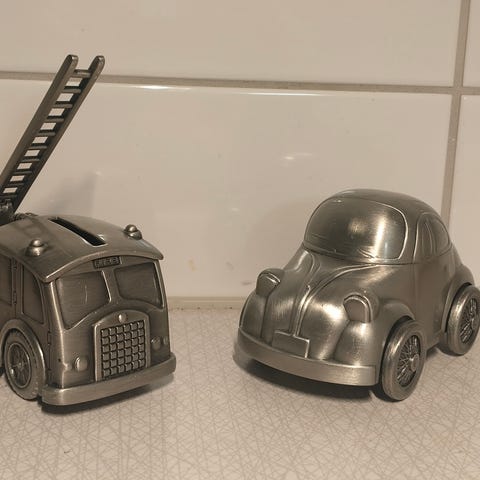 - Två lätt ovala och genomskinliga sparbössor, en röd och en grön, från Ovansjö Sparbank. Den gröna har några gamla mynt i sig som jag inte lyckats tömma ut.