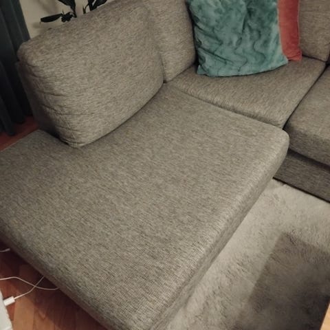 Soffa i mörkgrått tyg. Soffan har divan på ena sidan och raka sittplatser på den andra. Avtagbar/tvättbar klädsel. Djurfritt hem. Säljes i befintligt skick