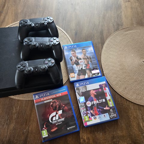 Säljer ett PS4 med 2 handkontroller och 4st spel. Alla kablar som behövs finns också med.