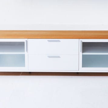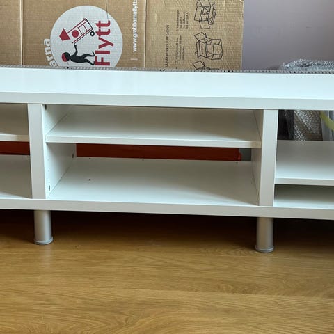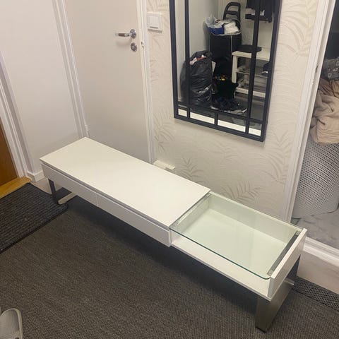 IKEA tv-bänk i högglans vit och en glasskiva ovanpå. Mittendörren är frostat glas.