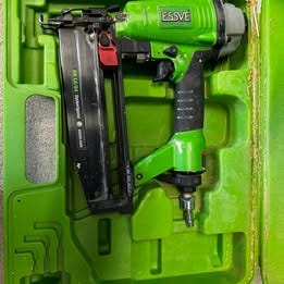 Essve FN 34/90 spikpistol för 34° bandad spik, 50–90 mm. Spikpistolen levereras i grön plastväska med formgjutet fack för verktyg och tillbehör. Lämplig för träkonstruktioner och snickeriarbeten där bandad spik i angiven längd används.