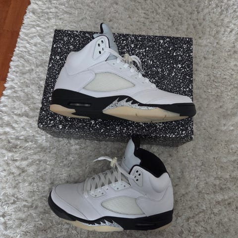 Air Jordan 5 Retro sneakers i storlek 42.,5. Modellen är en klassisk basketsneaker med högre skaft. Ovandel i syntet- och textilmaterial med detaljer i flera nyanser. Sulan är i gummi med synlig dämpning i hälen. Skorna levereras i originalkartong enligt bilderna. Passar som vardagssko eller för lättare sportaktiviteter.