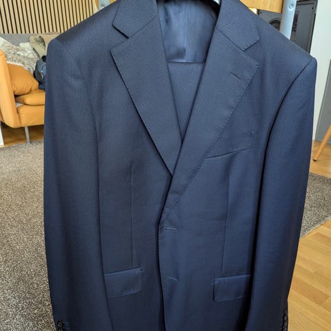 Mycket fin mörkblå fräsch kvalitets kostym i 100 ull med fint fall. Använd ett fåtal gånger och ser helt ny ut, men har blivit för stor för mig nu efter större viktnedgång. Både kostym och byxor är storlek 50S. För mest korrekt färgåtergivning se bil2 (på foder) där den blåa (kritstrecksrandig) färgen framträder mest korrekt.