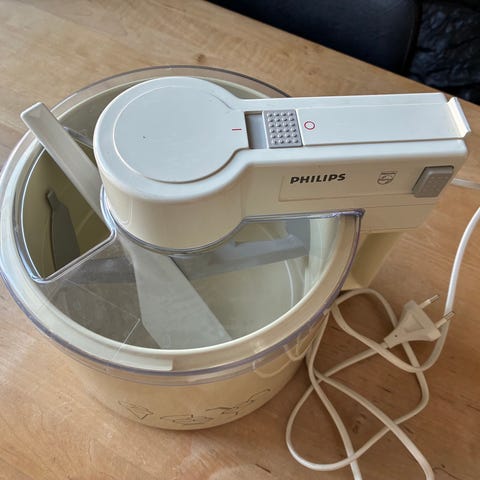 Philips glassmaskin i vit färg. Maskinen har en rund behållare med genomskinligt lock och handtag på sidan. På framsidan finns en enkel dekoration med glassmotiv. Passar för tillverkning av hemmagjord glass och frysta desserter i mindre satser i kök och hushåll.