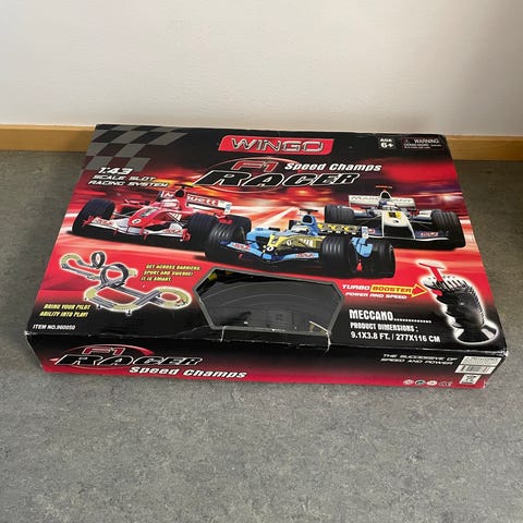 Banlängden är cirka 8,9 meter och körs med eldrivna slotbilar. Kan byggas i flera olika banlayouter enligt illustrationerna på förpackningen. Passar som leksak och hobbybana för barn och vuxna som vill köra bilbana hemma.