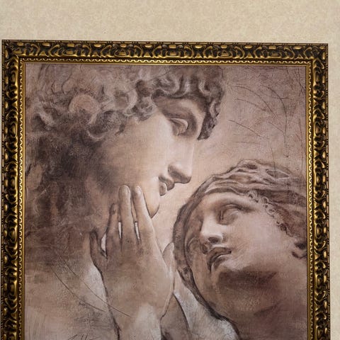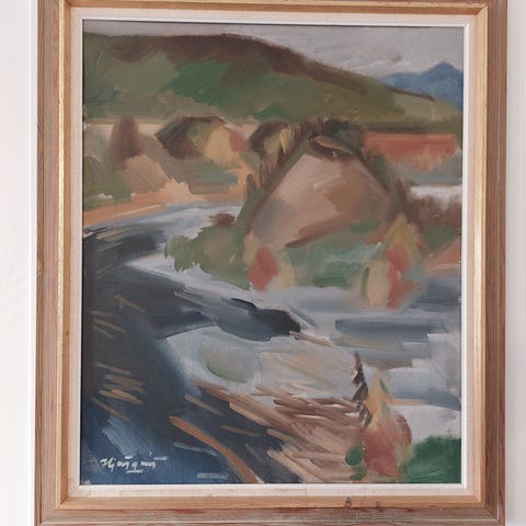 Tavla med abstrakt landskapsmotiv i dova gröna, bruna och grå toner. Motivet föreställer ett stiliserat landskap med träd och kullar. Målningen är inramad i en enkel, smal träram. Passar som väggdekoration i exempelvis vardagsrum, sovrum eller hall.