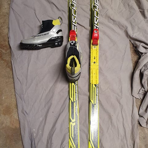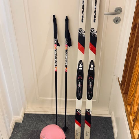 Rossignol längdskidor med Rottefella-bindningar, 130 cm långa. Längdstavar 95 cm fås på köpet, plasten nedtill på stavarna har tyvärr spruckit, se bild, men fungerar ok ändå.
