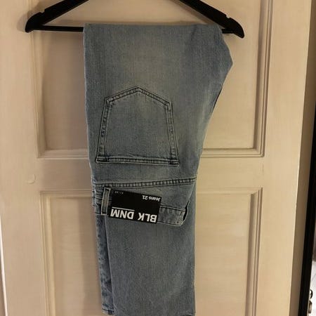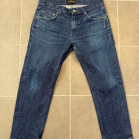 Ermenegildo Zegna jeans i slim fit-modell. Byxorna har en klassisk design med fem fickor och knappgylf. Detaljer inkluderar en logotypknapp och en läderlapp baktill i midjan. Storlek 31x26