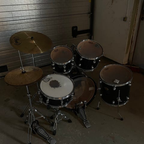 Premier trumset i svart utförande med flera pukor, bastrumma, virveltrumma och cymbaler. Setet inkluderar stativ för trummor och cymbaler samt trumstol/pall. Exakta storlekar på trummor och cymbaler mätas vid intresse.
