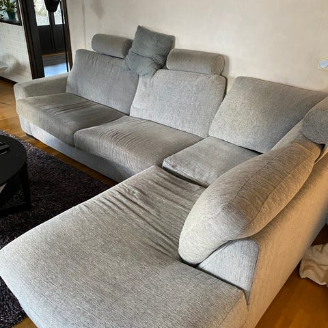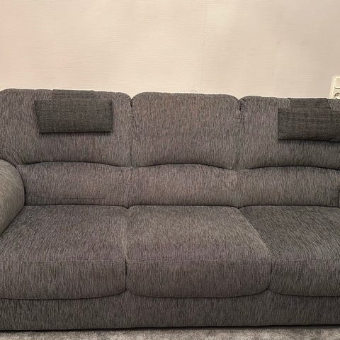 Stommen och stoppningen är ok men överdraget behöver bytas ut då det är utslitet på flera ställen och dragkedjorna till sittdynorna har gått sönder. Modellen finns inte längre på IKEA men nytt överdrag kan köpas via Bemz eller liknande. Då blir soffan som ny.