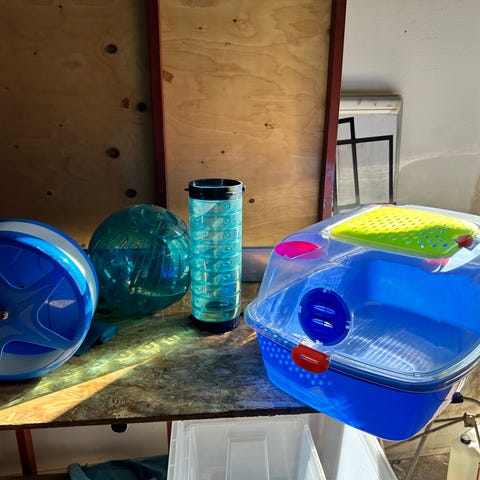 Ferplast smådjursbur med tillbehör i blå plast. Buren har plastbotten och galleröverdel med genomskinligt lock. I buren ingår flera tillbehör som vattenflaskor, matskålar, hus i trä, plasttunnel, hjul och olika plastdelar för aktivitet. Lämplig för mindre sällskapsdjur som exempelvis gnagare, enligt tillverkarens anvisningar.